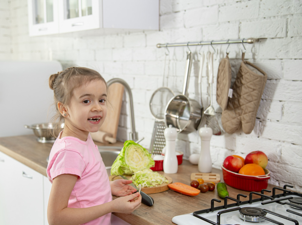 - 👧 Trẻ 4–6 tuổi: Cắt rau củ bằng dao nhựa, nạo phô mai, trang trí món ăn.